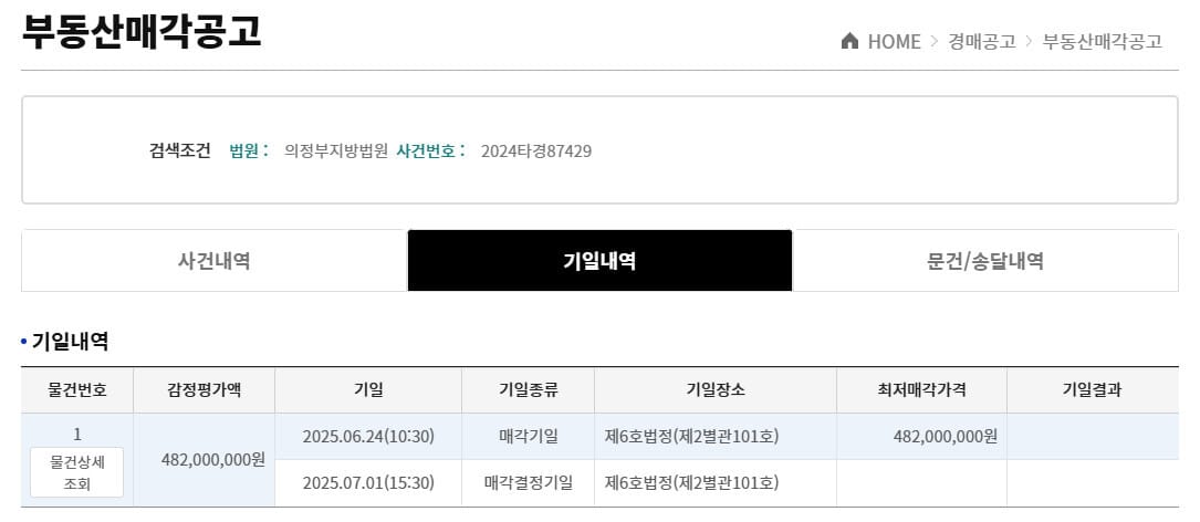 ➊ 입찰방법 및 매각기일: 기일입찰은 정해진 입찰일에 입찰자들이 모여 입찰을 하고 그날 바로 개찰하는 것이다. 위 그림의 ➊을 클릭하면 아래와 같이 입찰을 하는 날짜와 장소를 알 수 있습니다. 이 경매사건은 2025년 6월 24일 오전 10시 30분에 의정부지방법원 제6호 법정에서 입찰이 진행된다는 것을 알 수 있습니다.