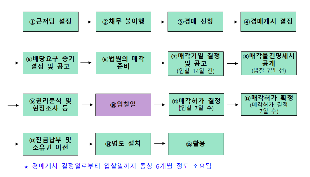 이번에는 일전에 포스팅한 부동산 경매 다섯 단계를 세부적으로 풀어서 경매 절차 전체를 조망해보는 시간으로 경매 물건이 경매에 나오는 순간부터 낙찰을 받고 명도를 끝낸 후, 활용할 때까지 전체 경매 절차를 일정과 함께 그림으로 한눈에 볼 수 있는 시간을 마련했습니다.