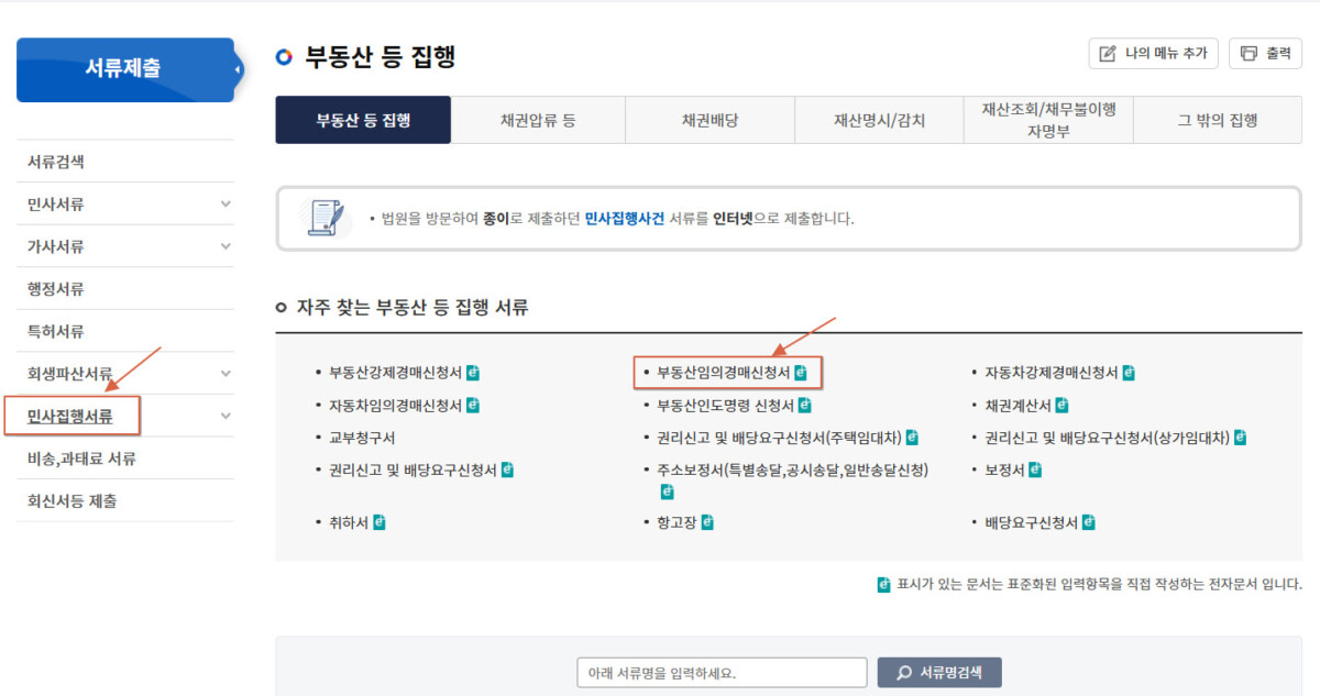 먼저 대한민국 법원 전자소송 사이트(ecfs.scourt.go.kr) 에 접속하여, 초기화면에서 [서류제출] → [민사집행서류] → [부동산 임의경매 신청서]를 클릭 후에, 절차에 따라 필요한 서류를 작성하면 경매 신청을 할 수 있습니다.